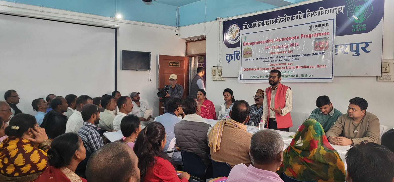 A one-day sponsored Entrepreneurship Awareness Programme (EAP) was organized on 24 February 2026 at Krishi Vigyan Kendra (KVK), Hariharpur, Vaishali under the aegis of ICAR–National Research Centre on Litchi, Muzaffarpur, with support from the Ministry of MSME, Government of India. The programme aimed to create awareness among women farmers, rural youth, SHGs, and aspiring entrepreneurs on litchi-based enterprises, processing, and value addition. The programme was inaugurated by Dr. Kavita Verma, Scientist (Home Science), under the guidance of Dr. Anil Kumar Singh, Senior Scientist & Head, KVK Vaishali. The programme was coordinated by Dr. Ipsita Samal (Agri. Entomology) and Er. Ankit Kumar, Scientist, ICAR–NRCL, Muzaffarpur. Participants appreciated the initiative. |