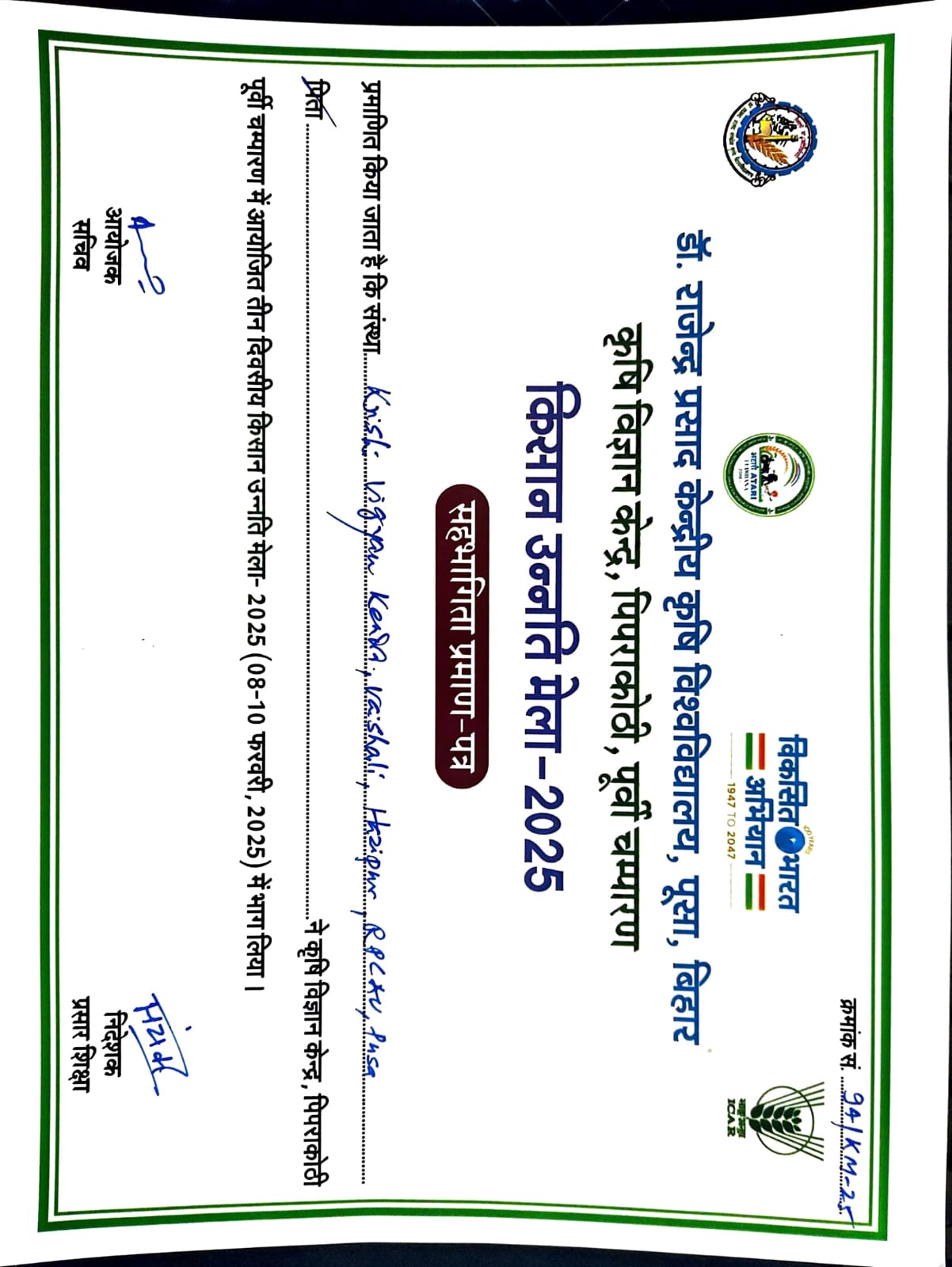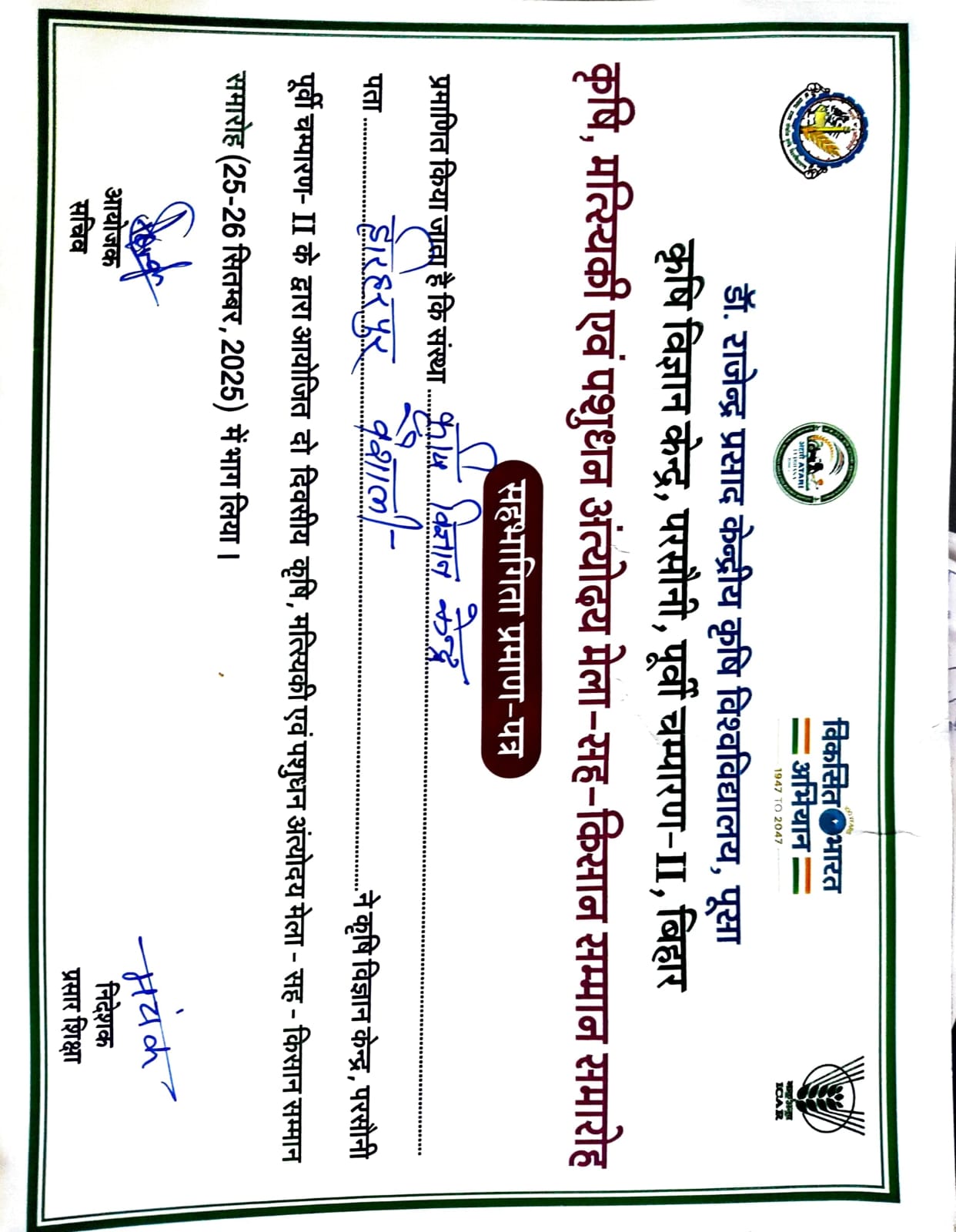 Participation Certificate, Samman Samaroh-sah-Krishi Pashudhan aivam Matsyaki Vikas Mela, KVK Piprakothi, RPCAU, Pusa |