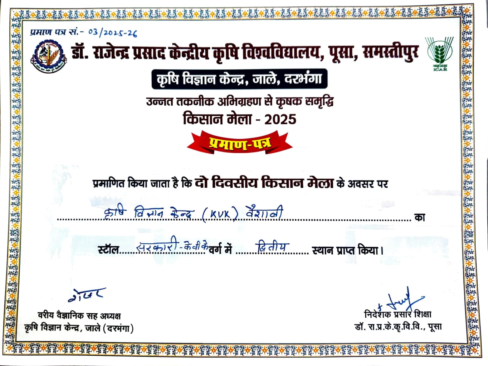 KVK Vaishali Second Position in Stall Category, "Unnat Taknik Abhigrahan se Krishak Samridhi" Kisan Mela and achieved second position in Government-KVK Stall Category, KVK, Jale, Darbhanga |