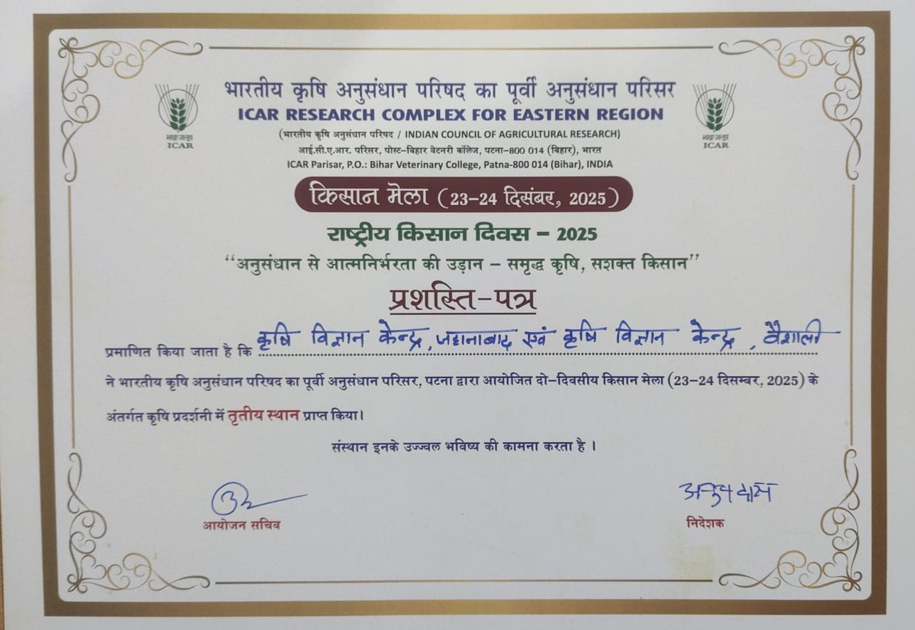 Appreciation Certificate for displaying of technologies of KVK Vaishali during Kisan Mela and attained third position in Krishi Pradarshini |