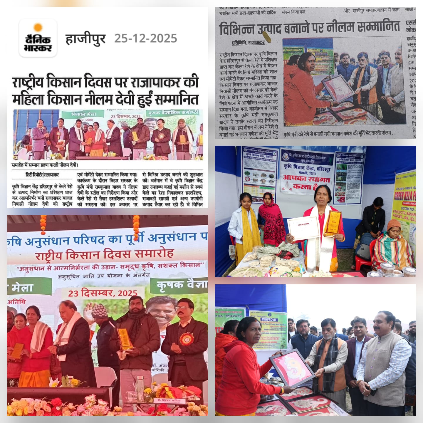 KVK Vaishali received appreciation certificate for displaying of Technologies and two progressive farmers Smt Neelam Devi, Smt Abha Kumari were felicitated during Kisan Mela fat ICAR-RCER, Patna. |